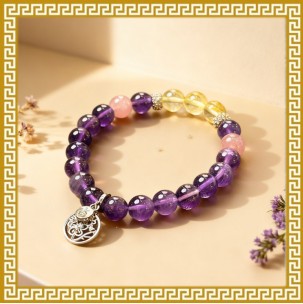 手串以「財富之石」金髮晶、「智慧之石」紫晶,以及「愛情之石」馬粉水晶組成,象徵貴人多助、廣結人緣,散發睿智及迷人的氣息。 「成就豐盛 - 金髮晶 紫晶 馬粉水晶手串...