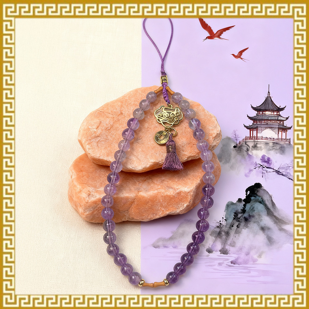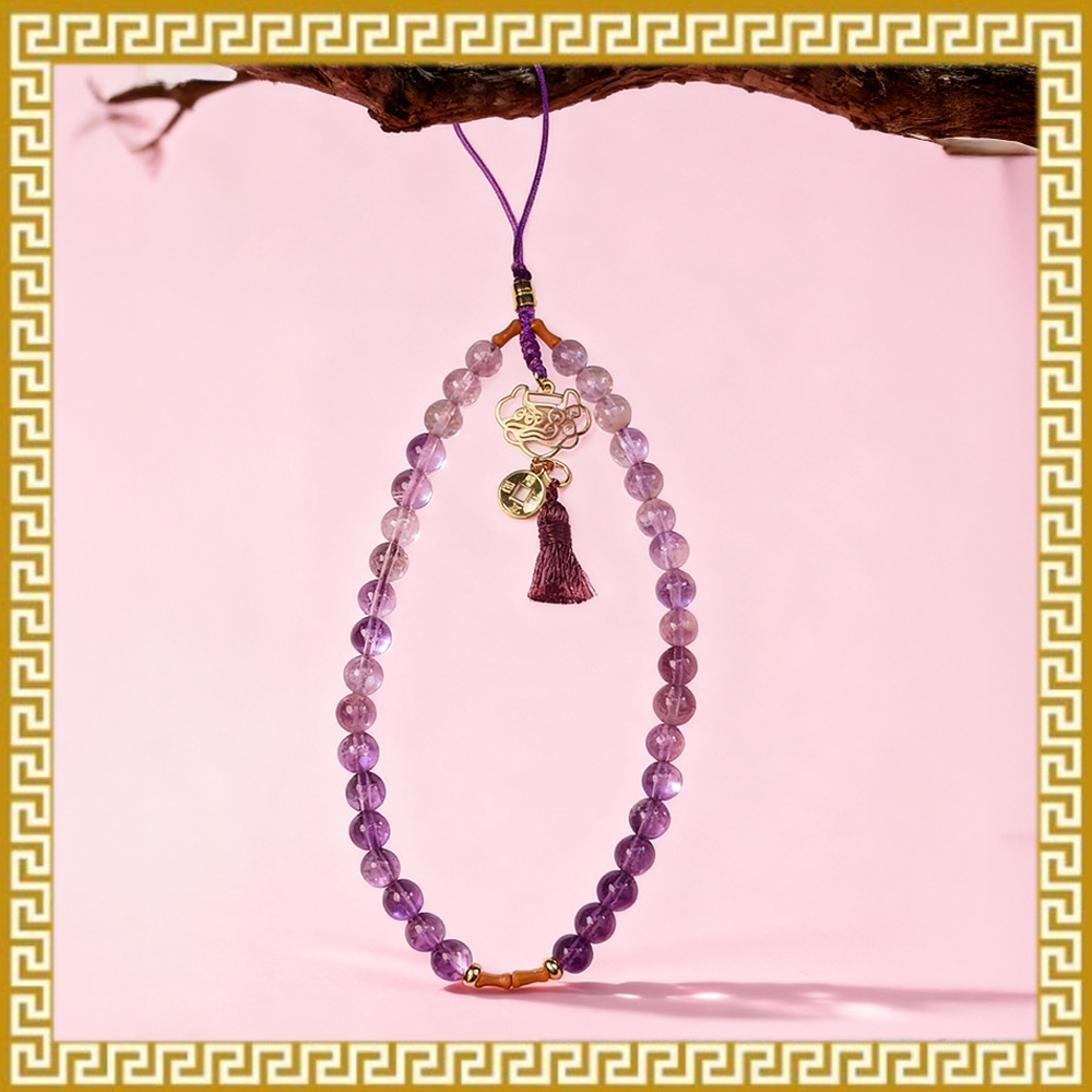 紫兔毛水晶激發魅力,祥雲吊墜牽引貴人機緣,搭配顯貴的鍍金算盤珠、福運珠,助你打破社交壁壘,締結優質人脈,貴人相助前程似錦。
