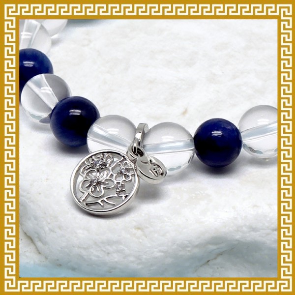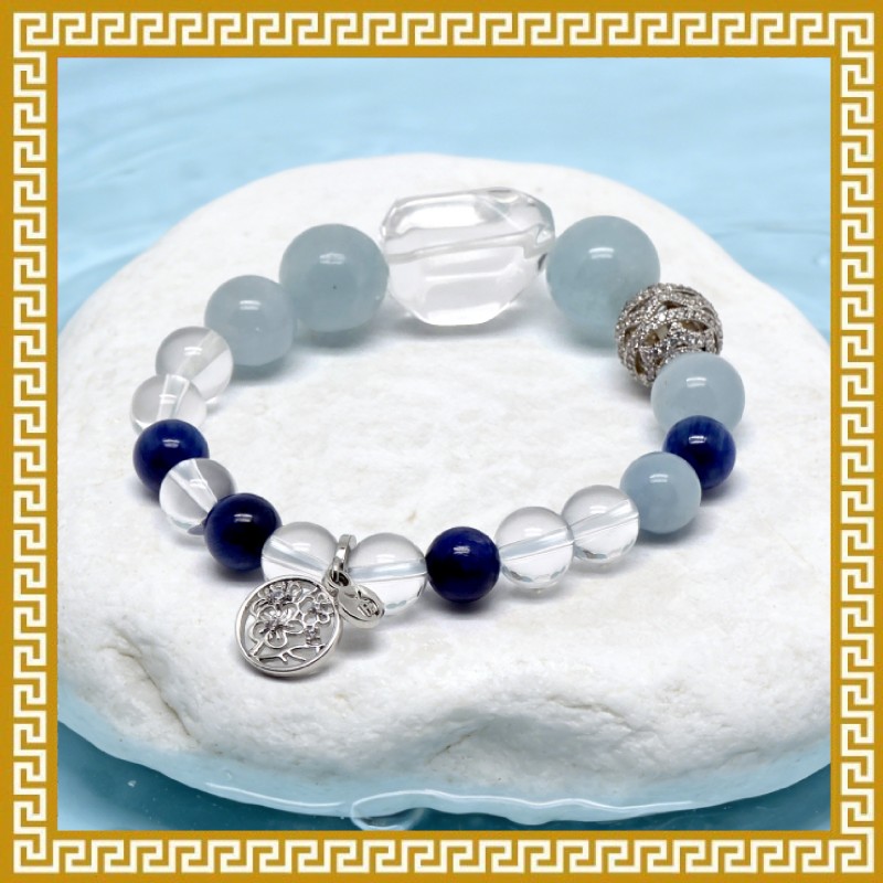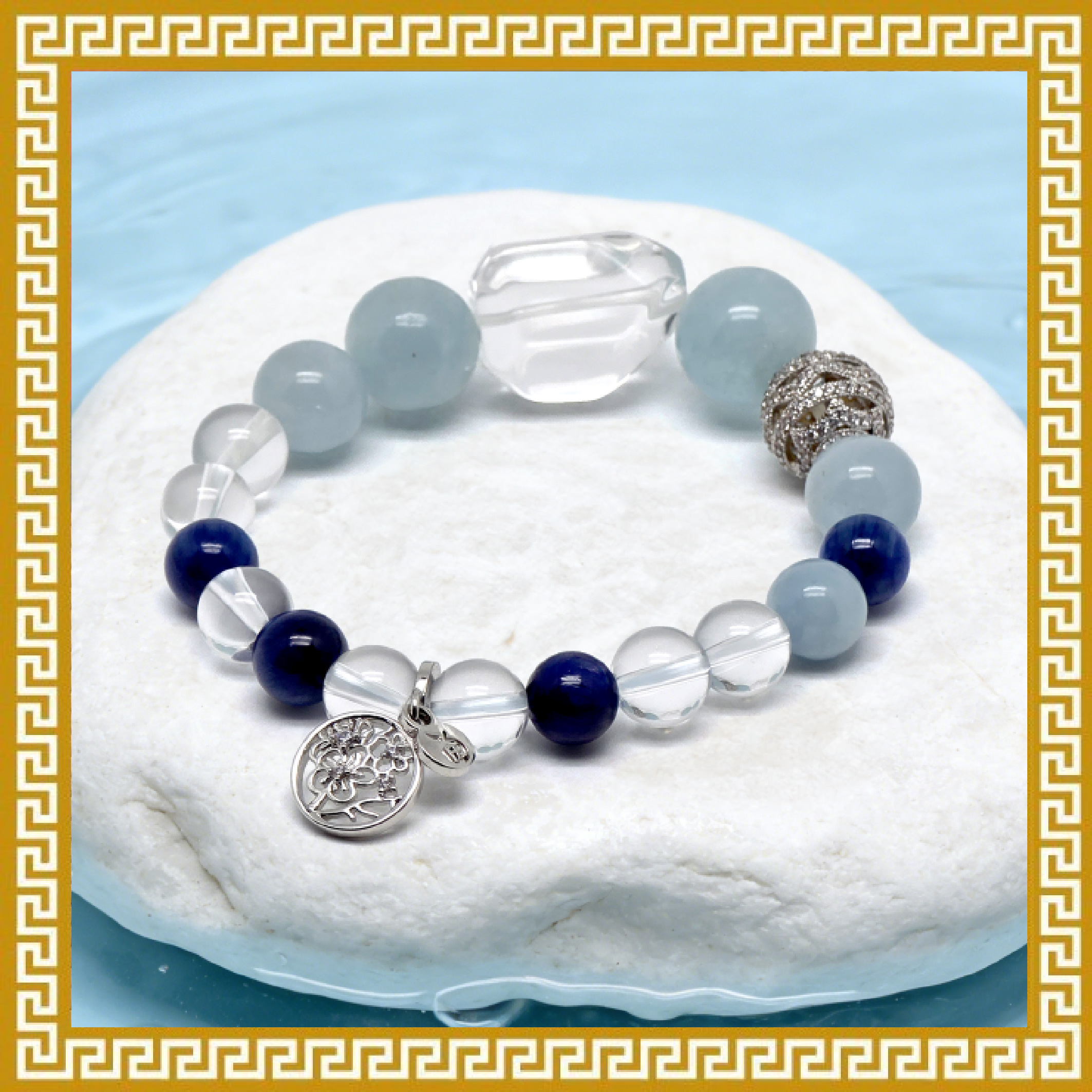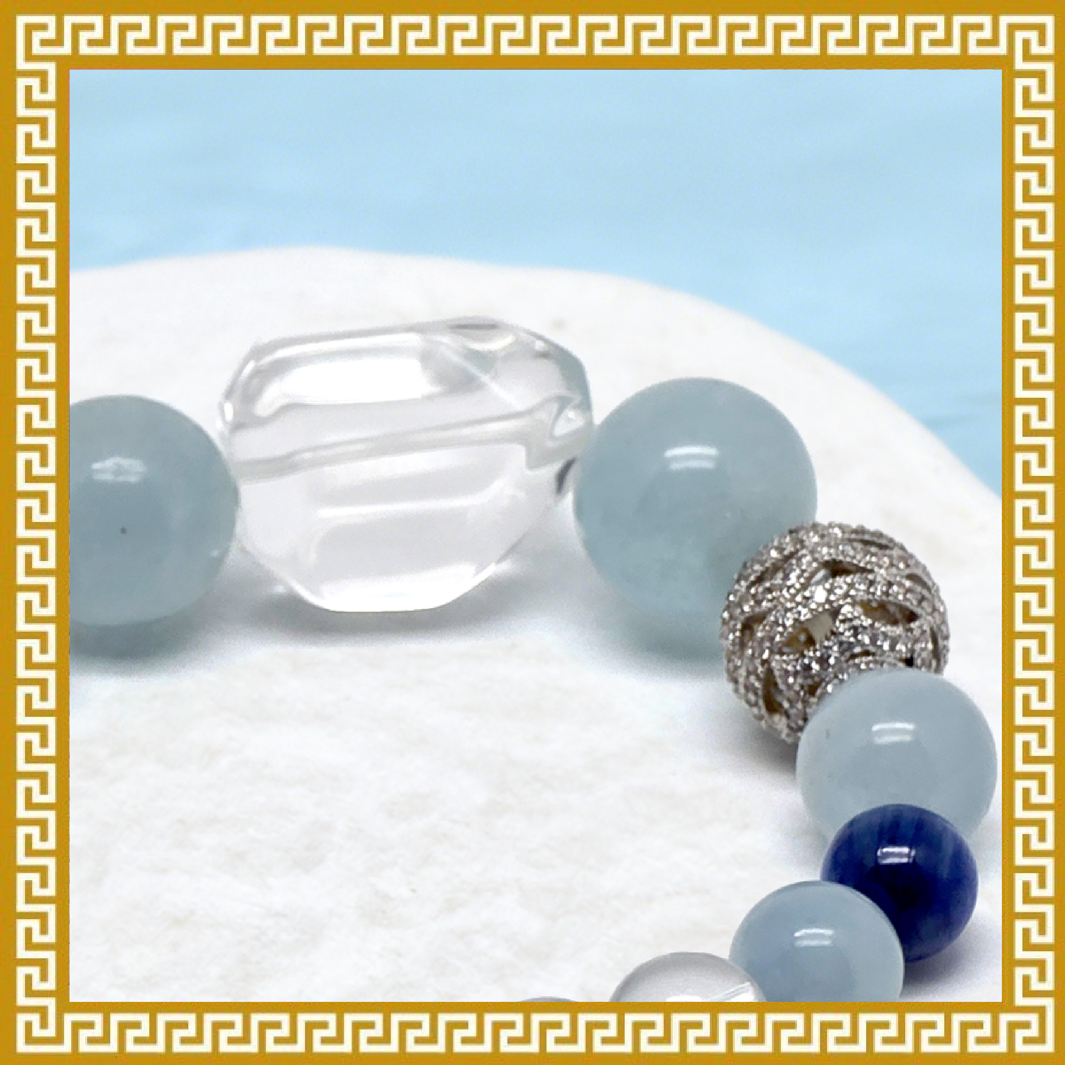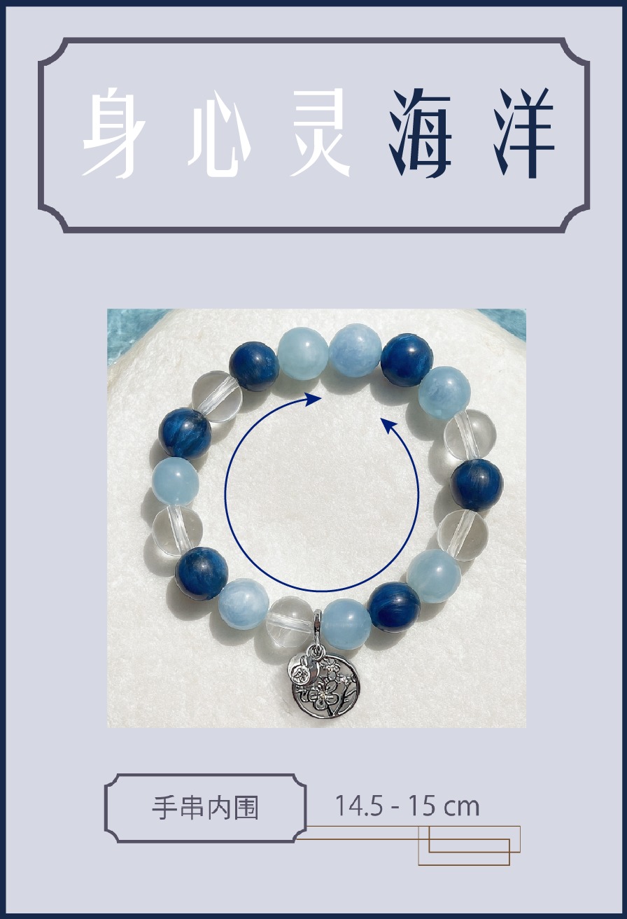 【身心靈海洋手串】由多顆優質10MM的藍晶石、 海藍寶、 白水晶組成,綴以閃爍璀璨的鍍白金配件,簡約雅致。
