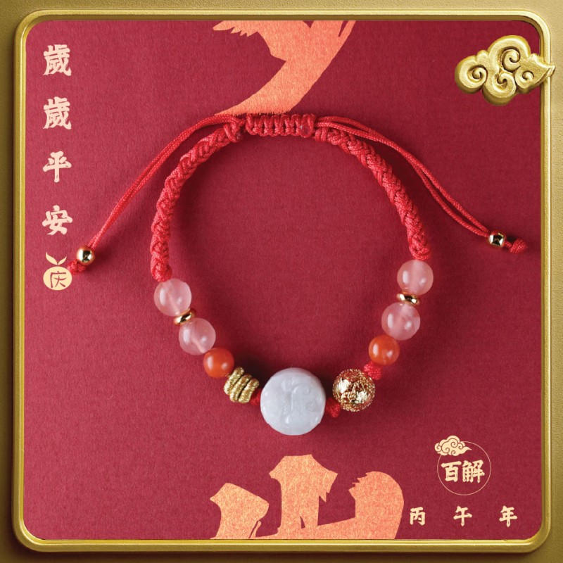 本年度的的「[百解]鴻運當頭隨身手繩」,不僅配上具趨吉避凶之效的「百解」造型玉石,更在此基礎上煥新進階 -- 手工精湛的的老師傅以八條高級紅繩編織成「發財編繩」,不但承載著紅繩傳統上的「搶旺化煞」寓意,更借工藝傳遞「發財必成,鴻運連連」的美好祈願。而繩間點綴手工打造的金色「轉運結」,則蘊含除舊佈新、運轉乾坤的祝福寓意,為佩戴者開啟好運征程。
